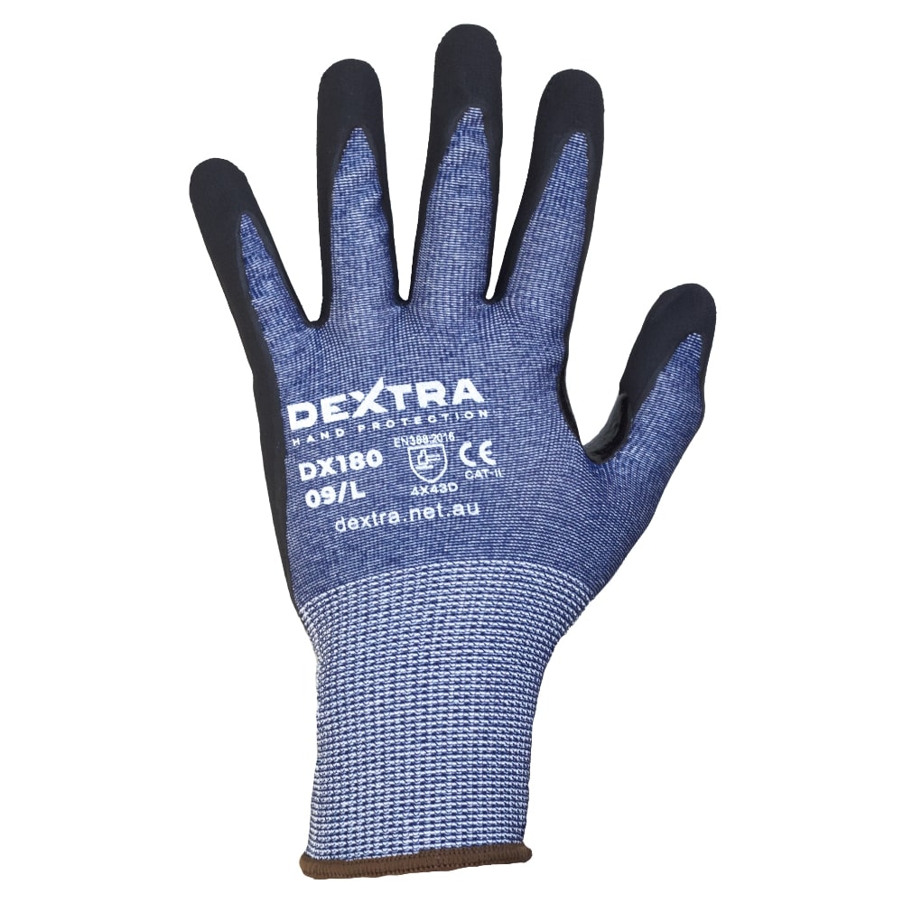 Cut 5 glove has a Nitrile Sandy finish on the palm for oil and water resistance. This glove has a superior grip in wet and dry conditions with unmatched fit, comfort and breathability. Part of Dextra’s Cut Resistant Glove range